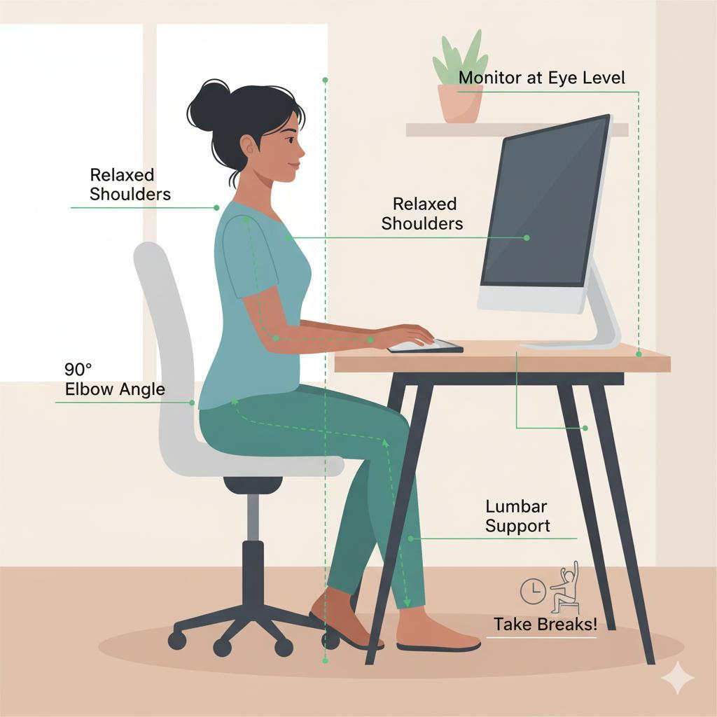 Multiple Screens: If you use two monitors, center your primary screen directly in front of you. If you use both equally, place them side-by-side and directly in front of you.